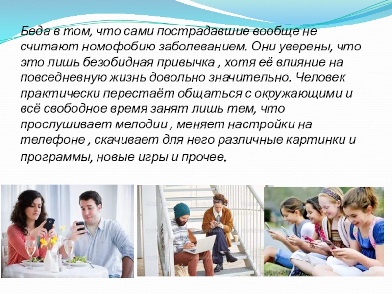 Слайд 5Беда в том, что сами пострадавшие вообще не считают номофобию заболеванием.