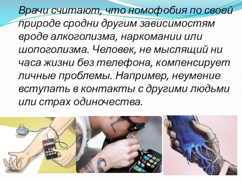Слайд 6Врачи считают, что номофобия по своей природе сродни другим зависимостям вроде
