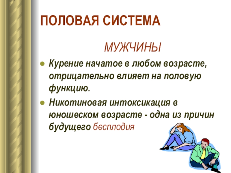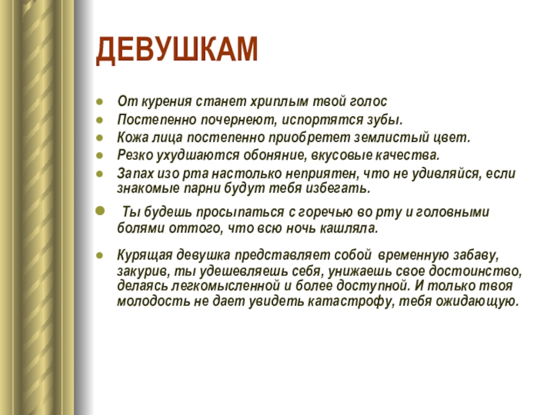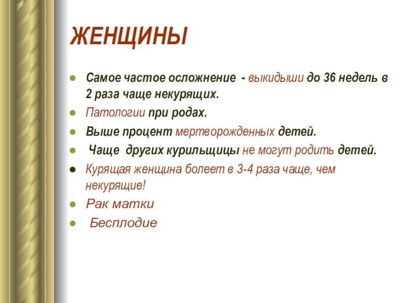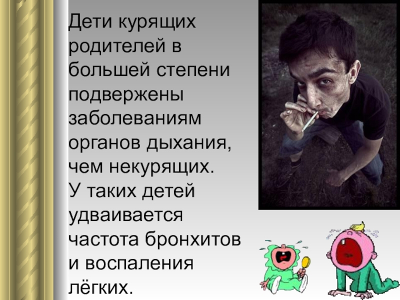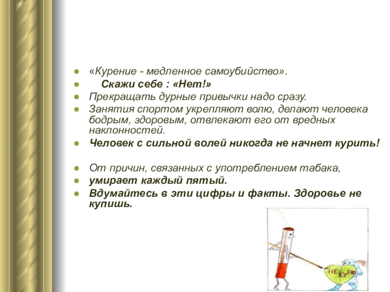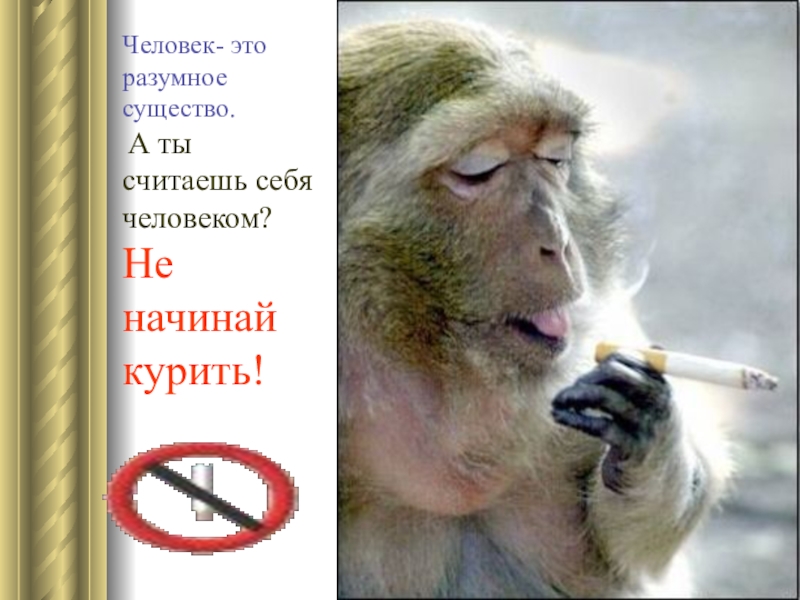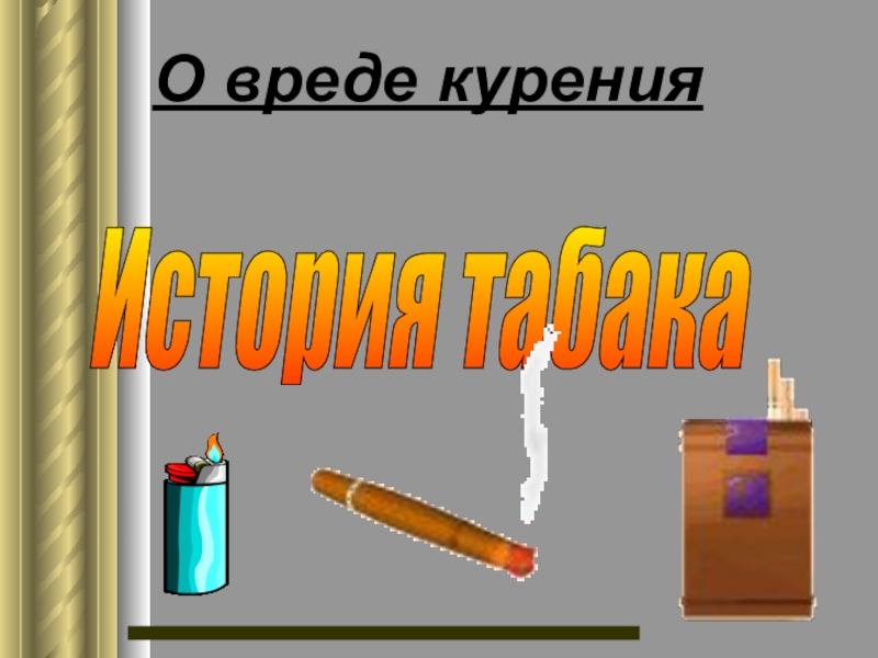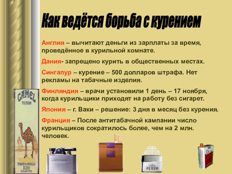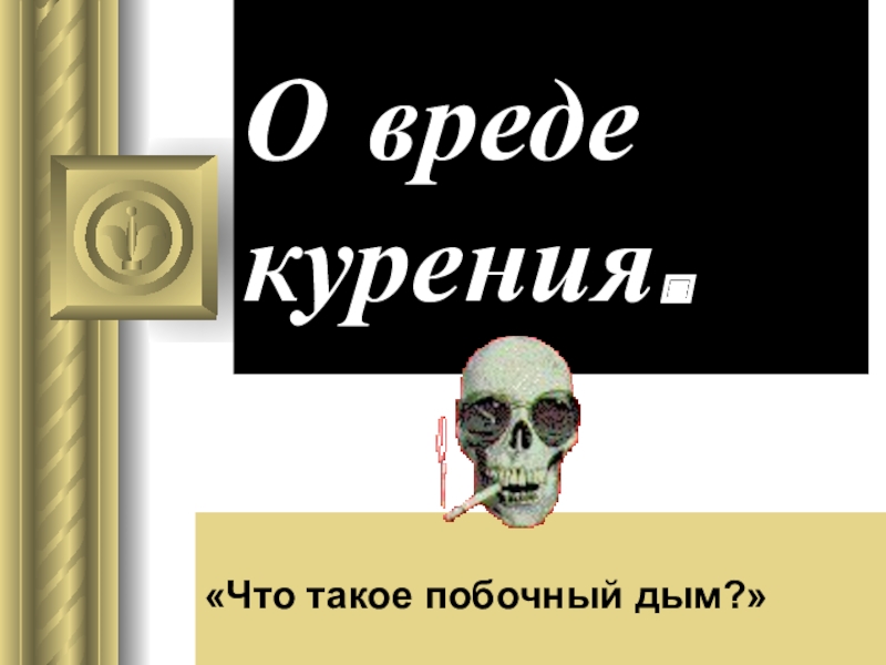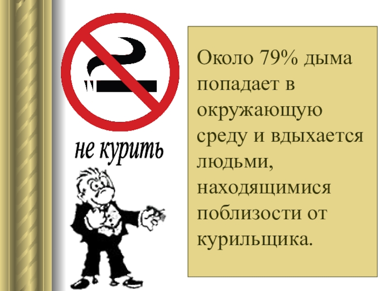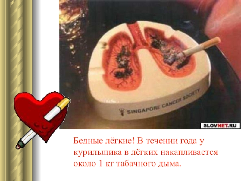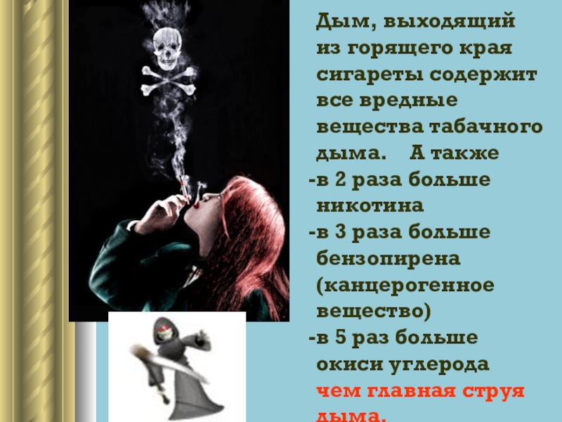 Табачный дым содержит более 4000 химических соединений, более сорока, из которых, вызывают рак, а также несколько сотен ядов, включая никотин, цианид, мышьяк, углекислый газ, окись углерода, т.д.