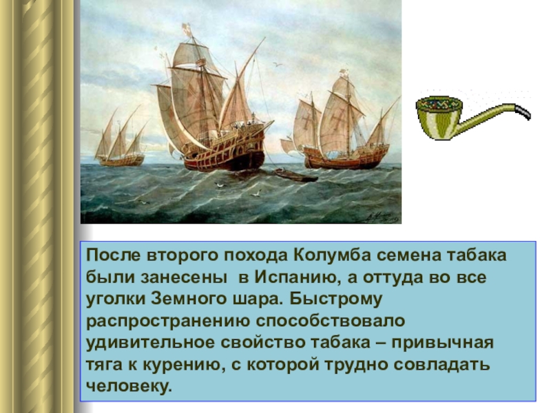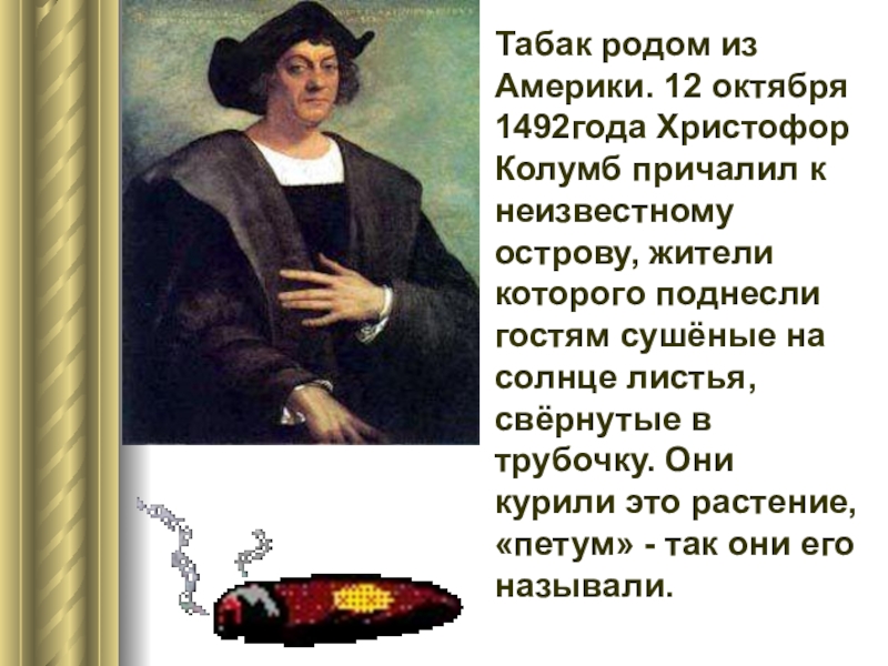 В Россию табак завезён английскими купцами в 1585 году через Архангельск.