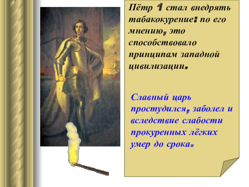 Славный царь простудился, заболел и вследствие слабости прокуренных лёгких умер до срока.