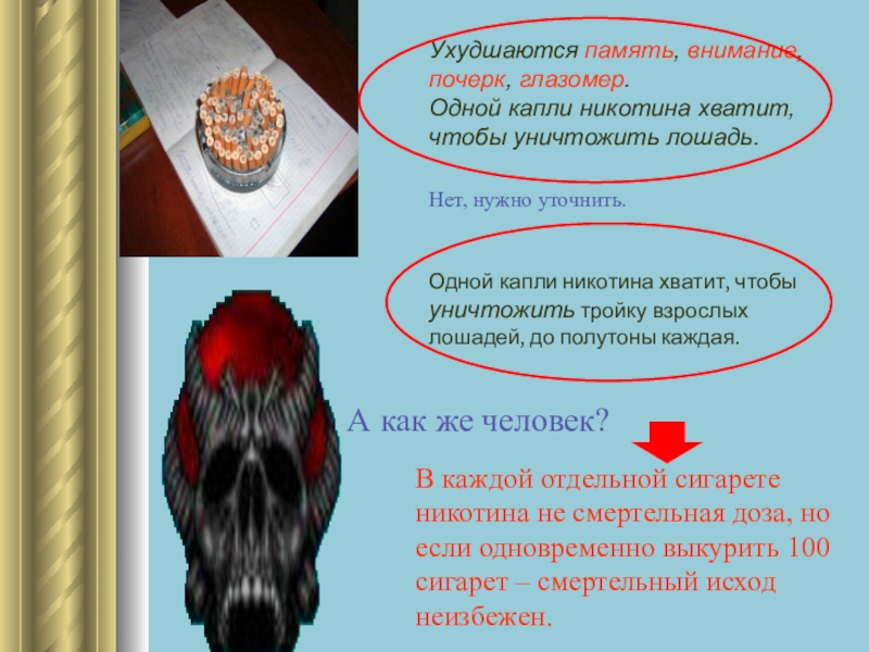 Одной капли никотина хватит, чтобы уничтожить тройку взрослых лошадей, до полутоны каждая.