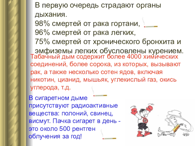 В сигаретном дыме присутствуют радиоактивные вещества: полоний, свинец, висмут. Пачка сигарет в день - это около 500 рентген облучения за год!