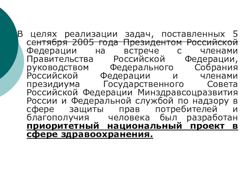 Федерации на встрече с членами Правительства Российской Федерации, руководством Федерального Собрания Российской Федерации и членами президиума Государственного Совета Российской Федерации Минздравсоцразвития России и Федеральной службой по надзору в сфере защиты прав потребителей и благополучия человека был разработан приоритетный национальный проект в сфере здравоохранения.