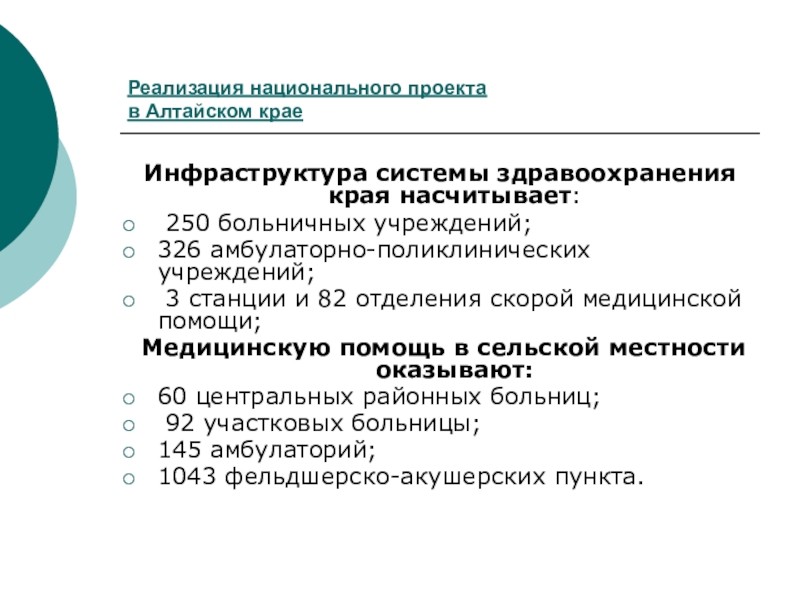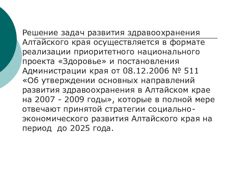 национального проекта «Здоровье» и постановления Администрации края от 08.12.2006 № 511 «Об утверждении основных направлений развития здравоохранения в Алтайском крае на 2007 - 2009 годы», которые в полной мере отвечают принятой стратегии социально-экономического развития Алтайского края на период до 2025 года.