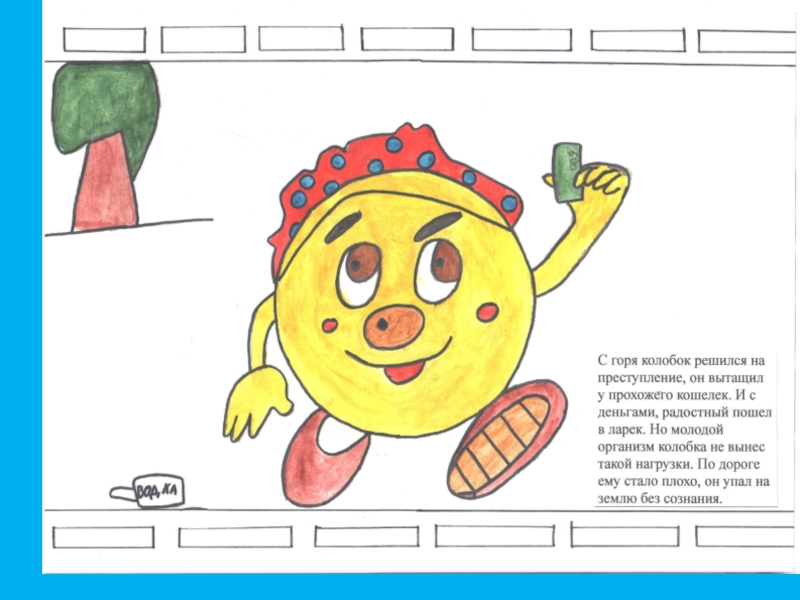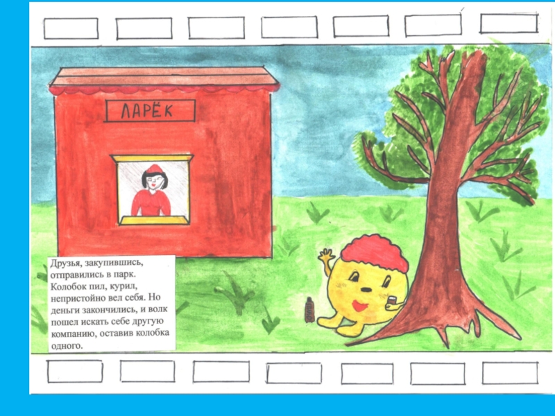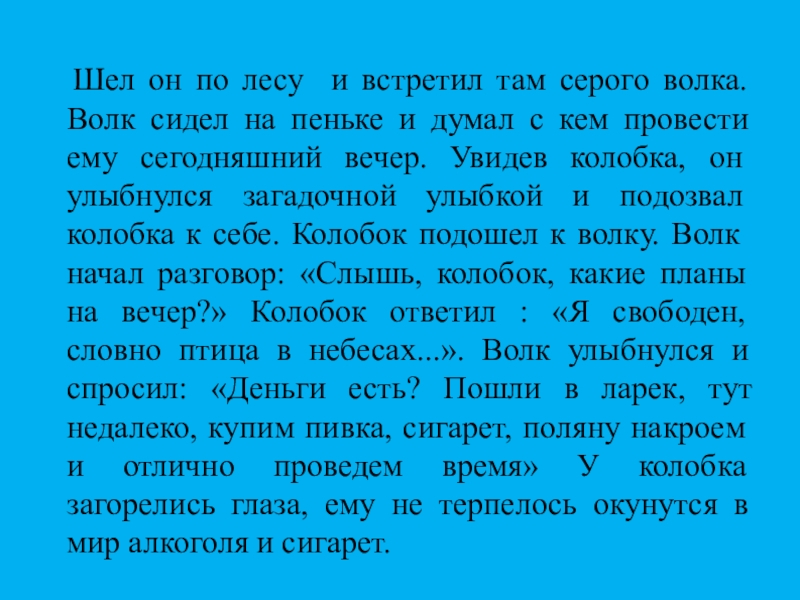 сидел на пеньке и думал с кем провести ему сегодняшний вечер. Увидев колобка, он улыбнулся загадочной улыбкой и подозвал колобка к себе. Колобок подошел к волку. Волк начал разговор: «Слышь, колобок, какие планы на вечер?» Колобок ответил : «Я свободен, словно птица в небесах...». Волк улыбнулся и спросил: «Деньги есть? Пошли в ларек, тут недалеко, купим пивка, сигарет, поляну накроем и отлично проведем время» У колобка загорелись глаза, ему не терпелось окунутся в мир алкоголя и сигарет.