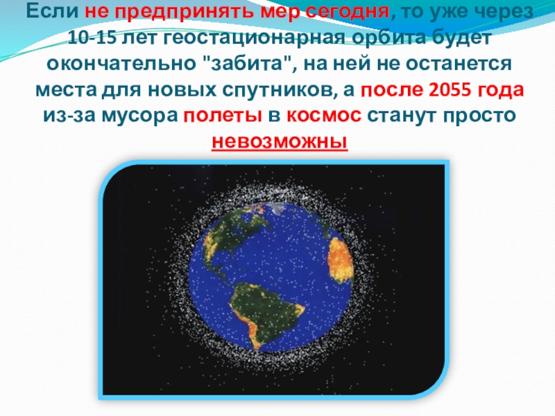 Слайд 21Если не предпринять мер сегодня, то уже через 10-15 лет геостационарная