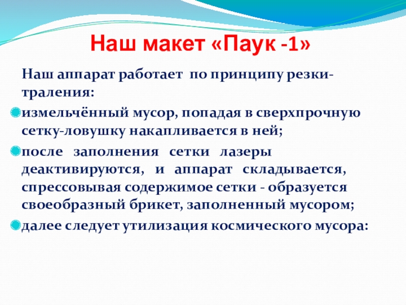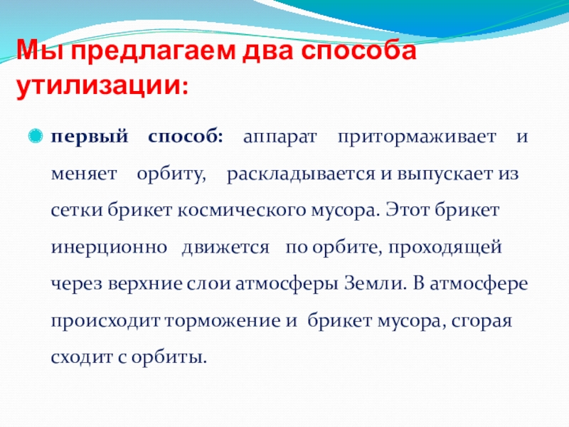 и меняет орбиту, раскладывается и выпускает из сетки брикет космического мусора. Этот брикет инерционно движется по орбите, проходящей через верхние слои атмосферы Земли. В атмосфере происходит торможение и брикет мусора, сгорая сходит с орбиты.