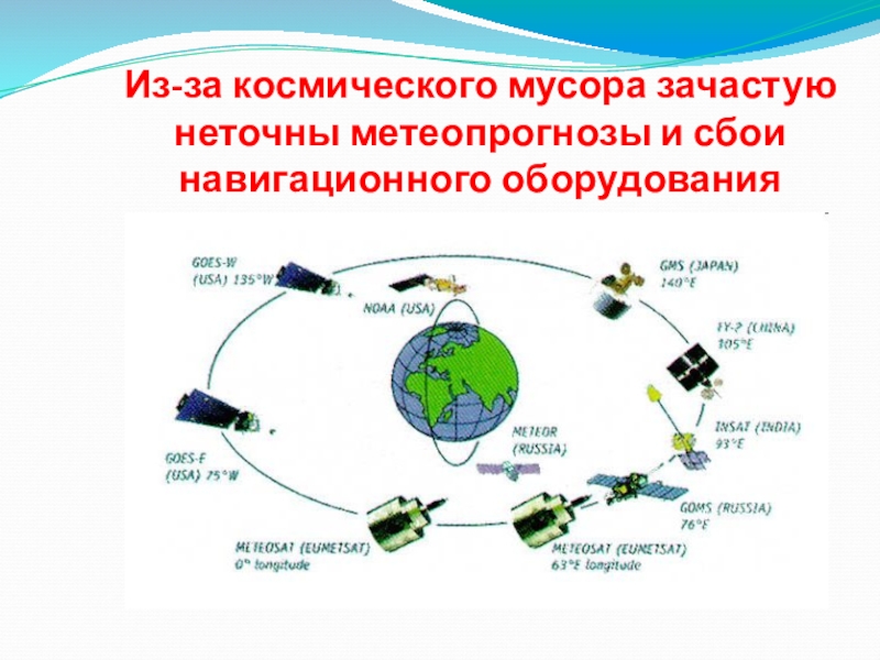 Слайд 12Из-за космического мусора зачастую неточны метеопрогнозы и сбои навигационного оборудования
