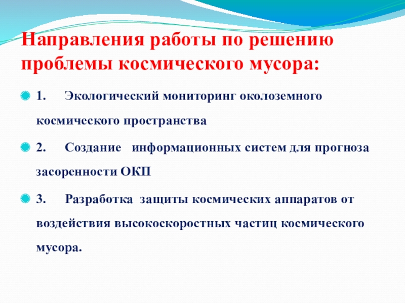 Слайд 30Направления работы по решению проблемы космического мусора: