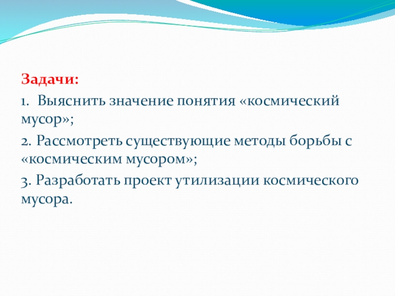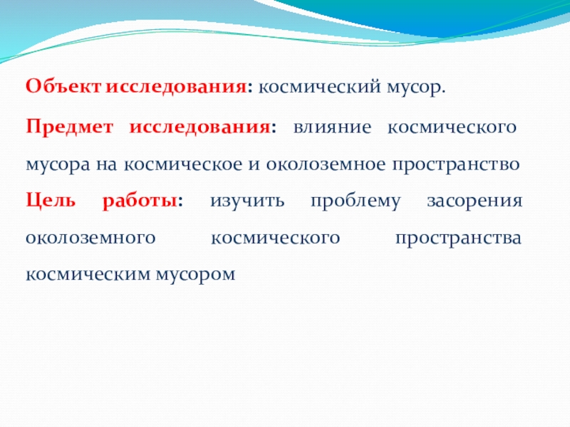 околоземное пространство Цель работы: изучить проблему засорения околоземного космического пространства космическим мусором
