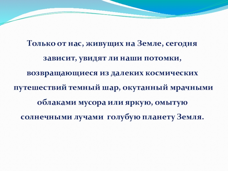 потомки, возвращающиеся из далеких космических путешествий темный шар, окутанный мрачными облаками мусора или яркую, омытую солнечными лучами голубую планету Земля.