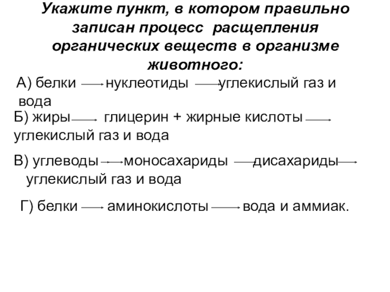 Г) белки аминокислоты вода и аммиак.
