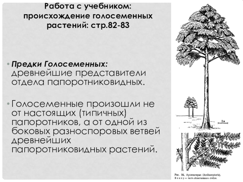 Работа с учебником: происхождение голосеменных растений: стр.82-83