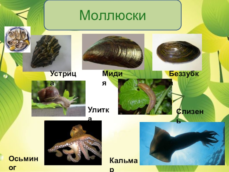 МоллюскиУстрицаМидияБеззубкаУлиткаСлизеньОсьминогКальмар