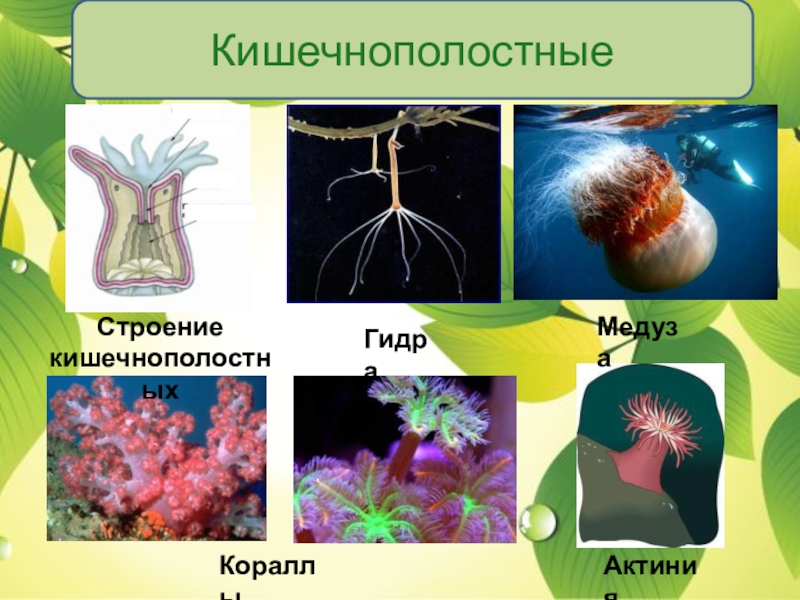 КишечнополостныеСтроение кишечнополостныхГидраМедузаКораллыАктиния