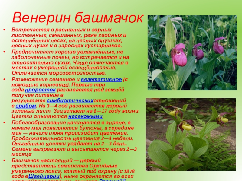Башмачок настоящий — первый представитель семейства Орхидные умеренного пояса, взятый под охрану (с 1878 года вШвейцарии), ныне охраняется во всех европейских странах , включая Россию[13].
