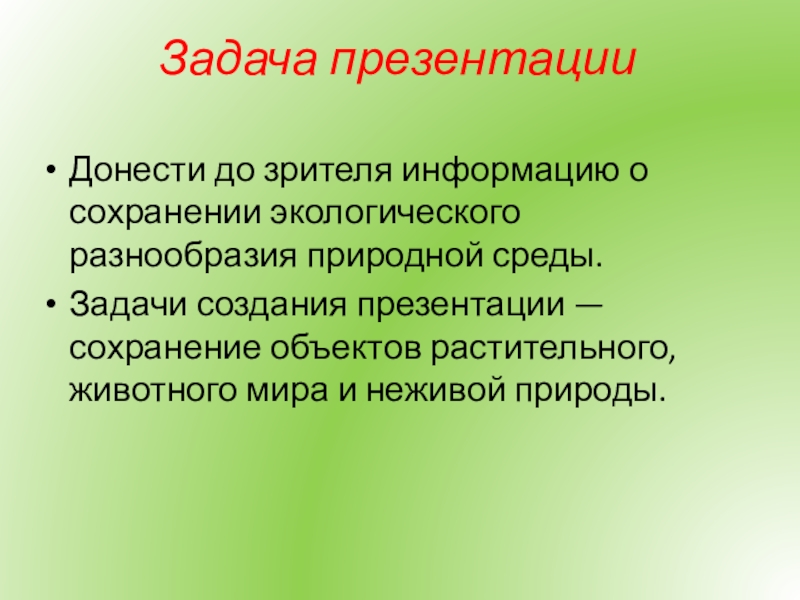 создания презентации — сохранение объектов растительного, животного мира и неживой природы.
