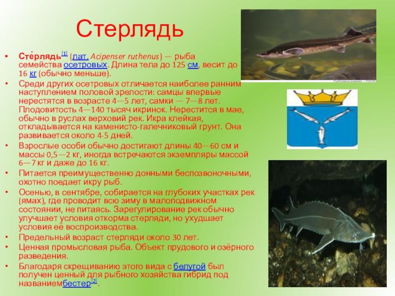 Сте́рлядь[1] (лат. Acipenser ruthenus) — рыба семейства осетровых. Длина тела до 125 см, весит до 16 кг (обычно