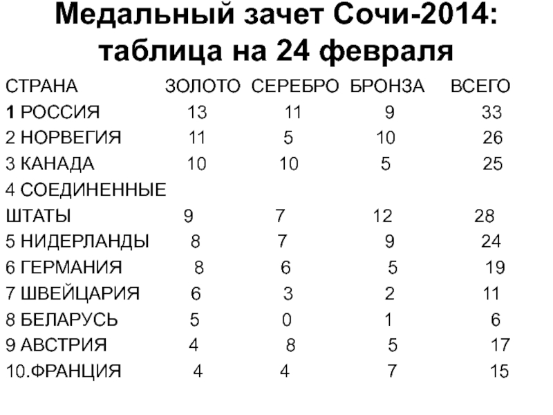 Слайд 52Медальный зачет Сочи-2014: таблица на 24 февраля