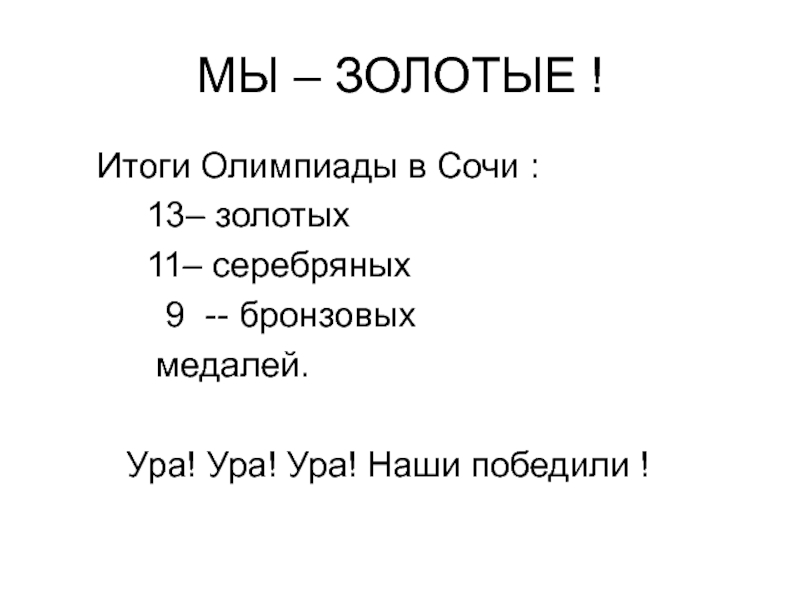 МЫ – ЗОЛОТЫЕ !   Итоги Олимпиады в Сочи :     13– золотых