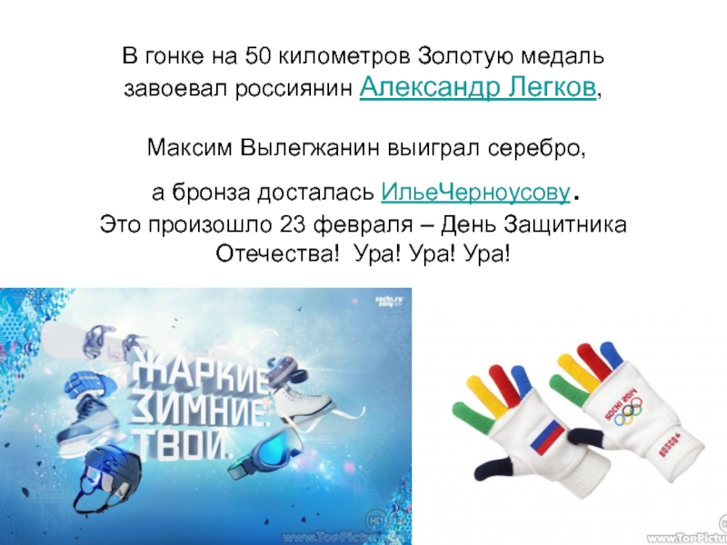 Максим Вылегжанин выиграл серебро, а бронза досталась ИльеЧерноусову. Это произошло 23 февраля – День Защитника Отечества! Ура! Ура! Ура!