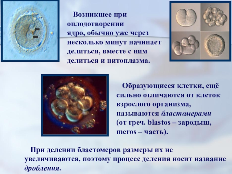 Образующиеся клетки, ещё сильно отличаются от клеток взрослого организма, называются бластомерами
