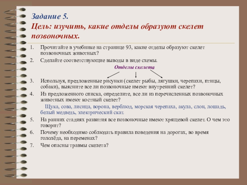 Цель: изучить, какие отделы образуют скелет позвоночных.