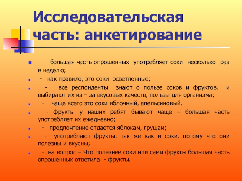 Провести социологическое исследование среди обучающихся школы об употреблении соков и фруктов.