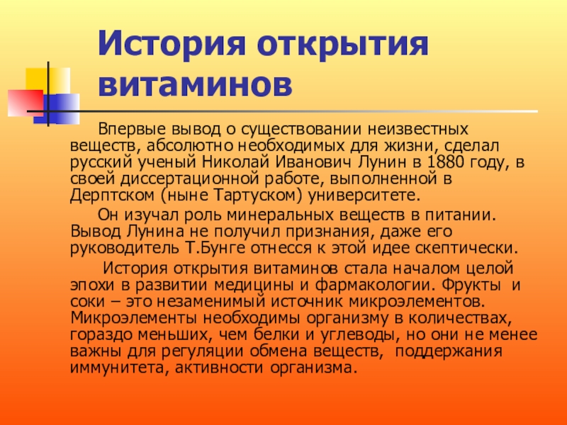 Он изучал роль минеральных веществ в питании. Вывод Лунина не получил признания, даже его руководитель Т.Бунге отнесся к этой идее скептически.