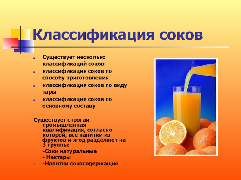 Существует строгая промышленная квалификация, согласно которой, все напитки из фруктов и ягод разделяют на 3 группы: