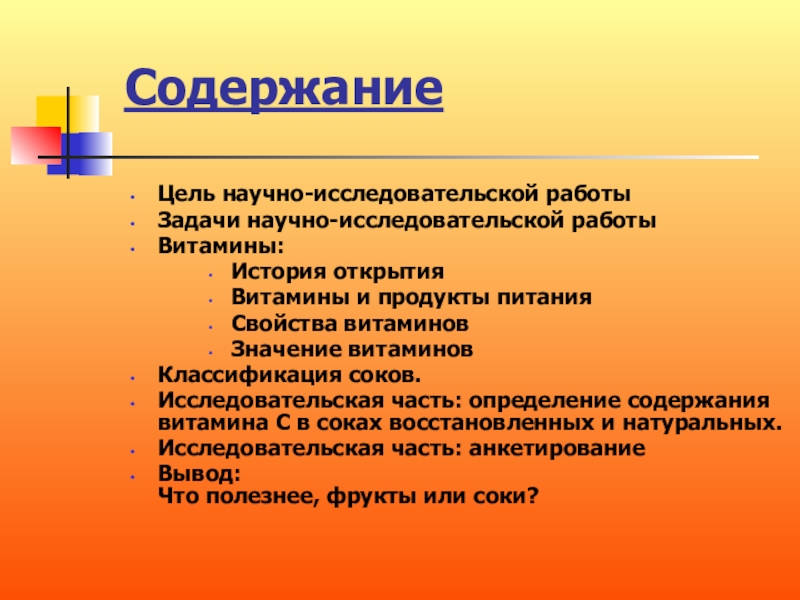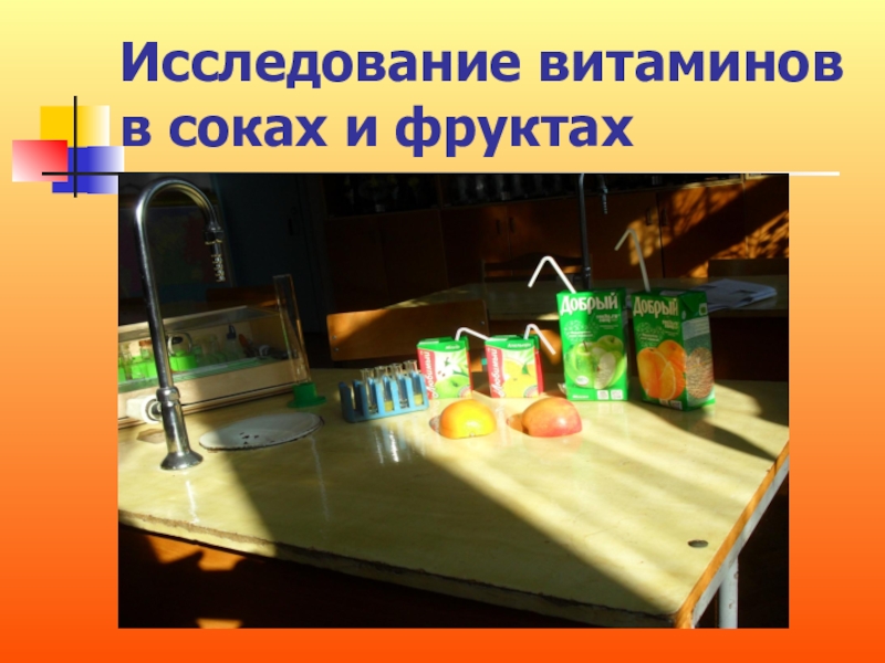 Слайд 15Исследование содержания витамина С в соках и фруктах.