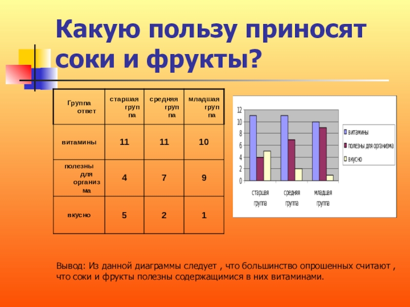 - все респонденты знают о пользе соков и фруктов, и выбирают их из – за вкусовых качеств, пользы для организма;