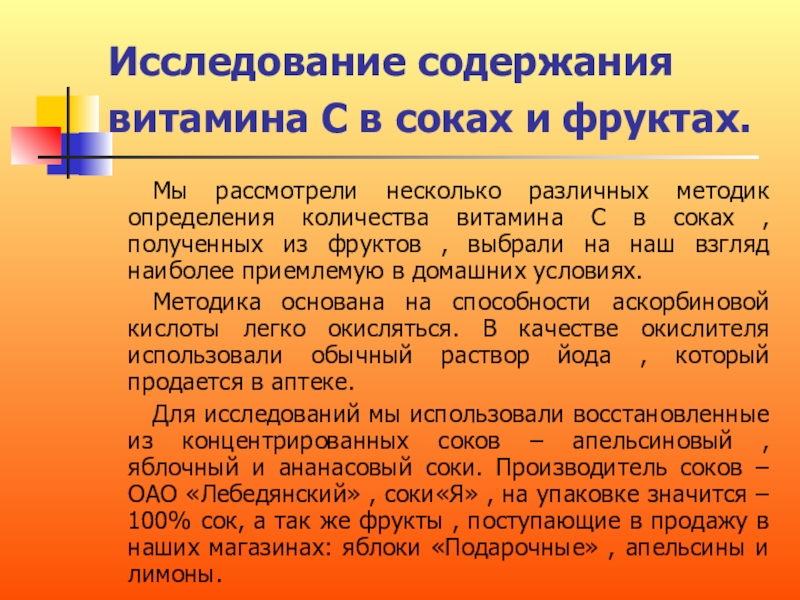 различных методик определения количества витамина С в соках ,полученных из фруктов , выбрали на наш взгляд наиболее приемлемую в домашних условиях.