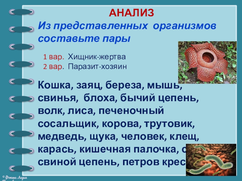 Кошка, заяц, береза, мышь, свинья, блоха, бычий цепень, волк, лиса, печеночный сосальщик, корова, трутовик, медведь, щука, человек, клещ, карась, кишечная палочка, сова, свиной цепень, петров крест.