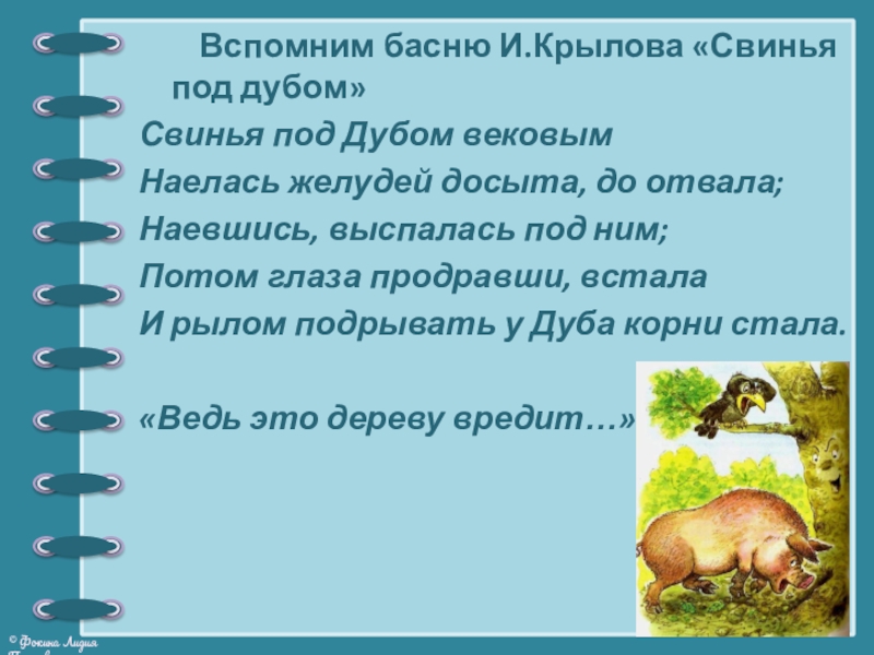 Слайд 11 Вспомним басню И.Крылова «Свинья под дубом»