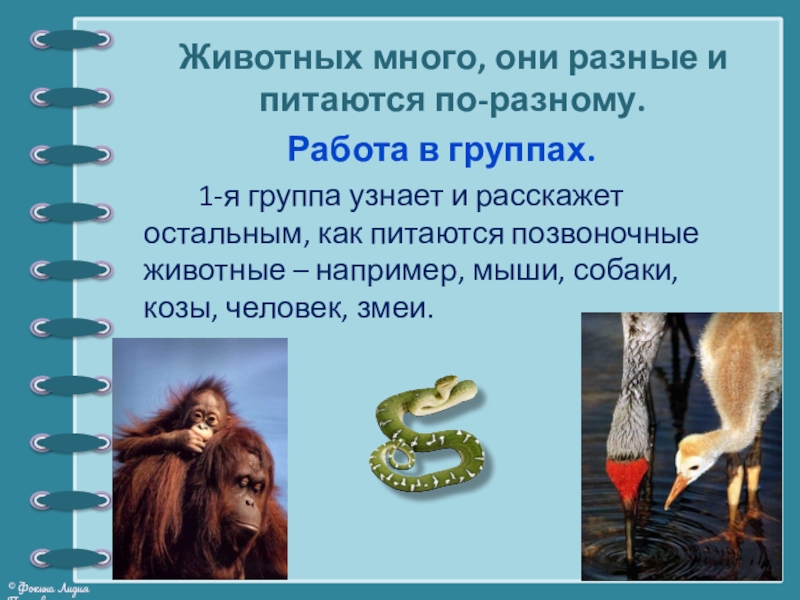 1-я группа узнает и расскажет остальным, как питаются позвоночные животные – например, мыши, собаки, козы, человек, змеи.