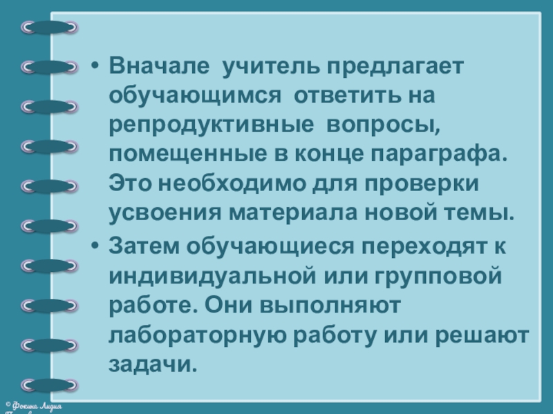 Слайд 19Вначале учитель предлагает обучающимся ответить на репродуктивные вопросы, помещенные в конце