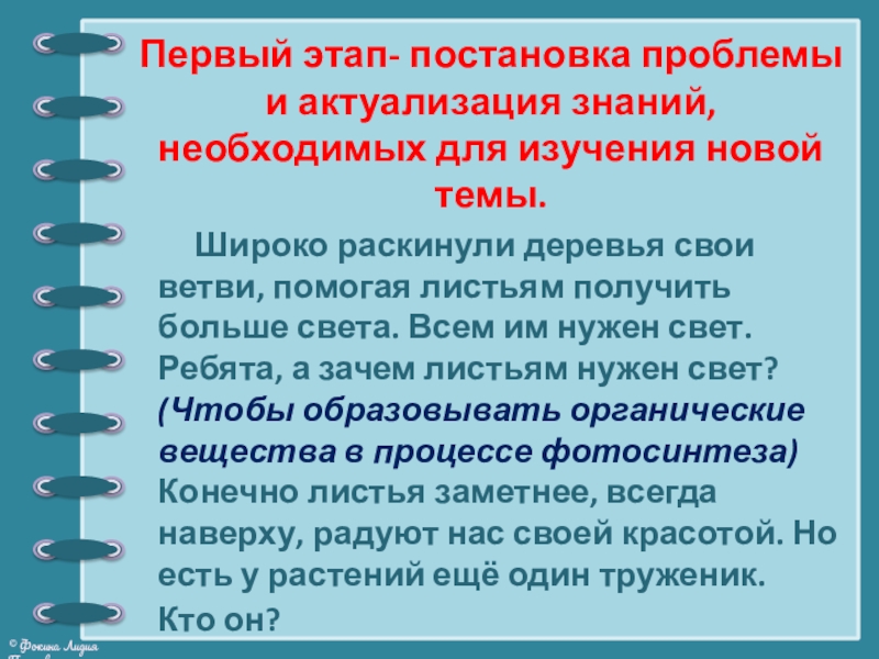 Широко раскинули деревья свои ветви, помогая листьям получить больше света. Всем им нужен свет. Ребята, а зачем листьям нужен свет? (Чтобы образовывать органические вещества в процессе фотосинтеза) Конечно листья заметнее, всегда наверху, радуют нас своей красотой. Но есть у растений ещё один труженик. Кто он?