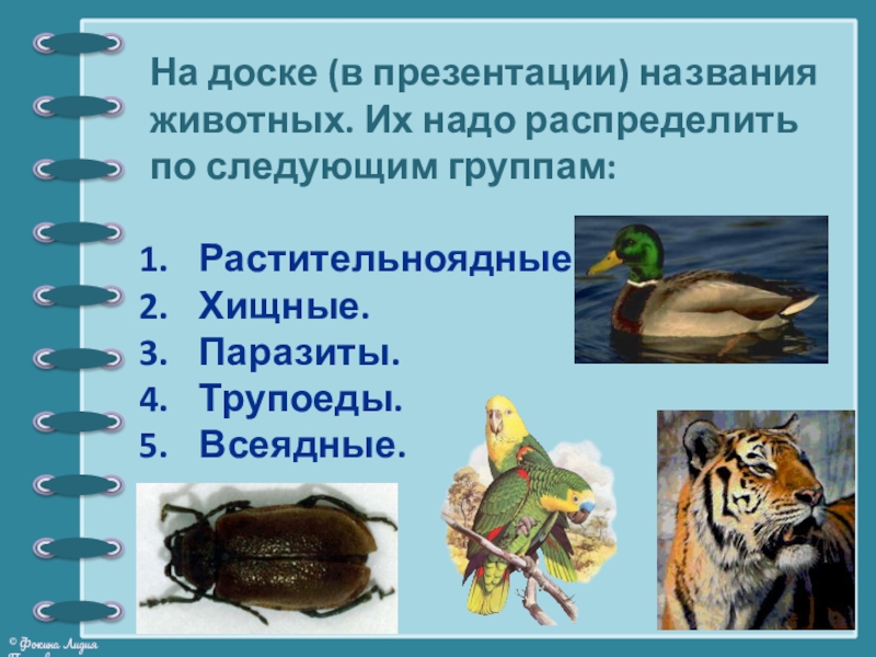 Слайд 20На доске (в презентации) названия животных. Их надо распределить по следующим
