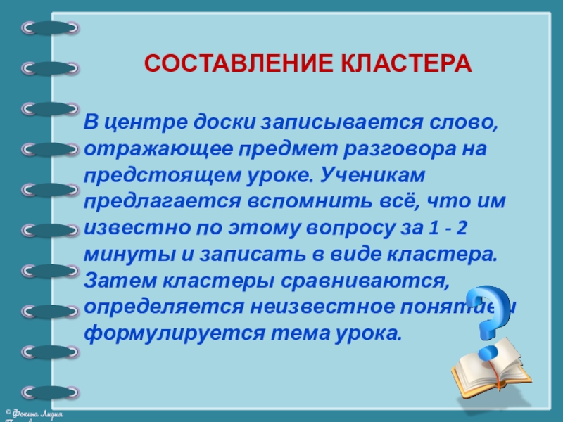 уроке. Ученикам предлагается вспомнить всё, что им известно по этому вопросу за 1 - 2 минуты и записать в виде кластера. Затем кластеры сравниваются, определяется неизвестное понятие и формулируется тема урока.