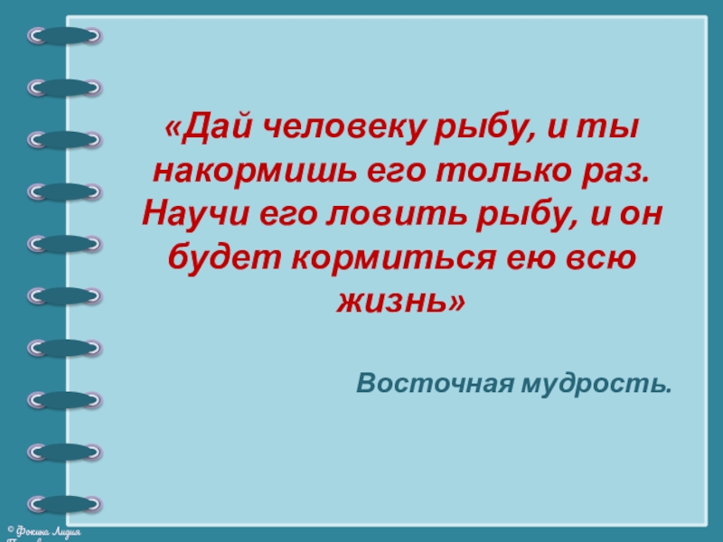 Слайд 2«Дай человеку рыбу, и ты накормишь его только раз. Научи его