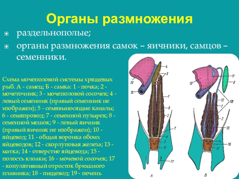 хрящевых рыб. А - самец; Б - самка: 1 - почка; 2 - мочеточник; 3 - мочеполовой сосочек; 4 - левый семенник (правый семенник не изображен); 5 - семявыносящие каналы; 6 - семяпровод; 7 - семенной пузырек; 8 - семенной мешок; 9 - левый яичник (правый яичник не изображен); 10 - яйцевод; 11 - общая воронка обоих яйцеводов; 12 - скорлуповая железа; 13 - матка; 14 - отверстие яйцевода; 15 - полость клоаки; 16 - мочевой сосочек; 17 - копулятивный отросток брюшного плавника; 18 - пищевод; 19 - печень