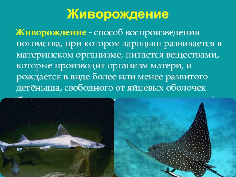 Живорождение  Живорождение - способ воспроизведения потомства, при котором зародыш развивается в материнском организме, питается веществами, которые
