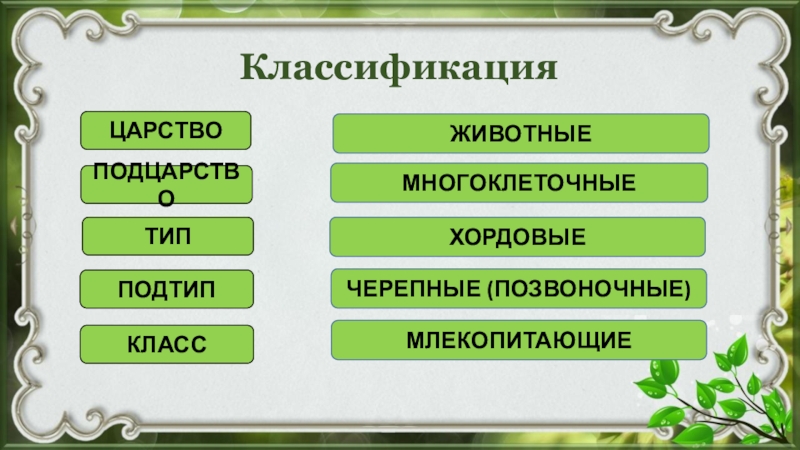 КлассификацияЦАРСТВОЖИВОТНЫЕПОДЦАРСТВОТИППОДТИПКЛАССМНОГОКЛЕТОЧНЫЕХОРДОВЫЕЧЕРЕПНЫЕ (ПОЗВОНОЧНЫЕ)МЛЕКОПИТАЮЩИЕ