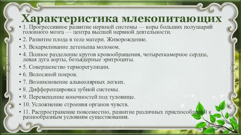 Характеристика млекопитающих1. Прогрессивное развитие нервной системы — коры больших полушарий головного мозга — центра высшей нервной деятельности.2.