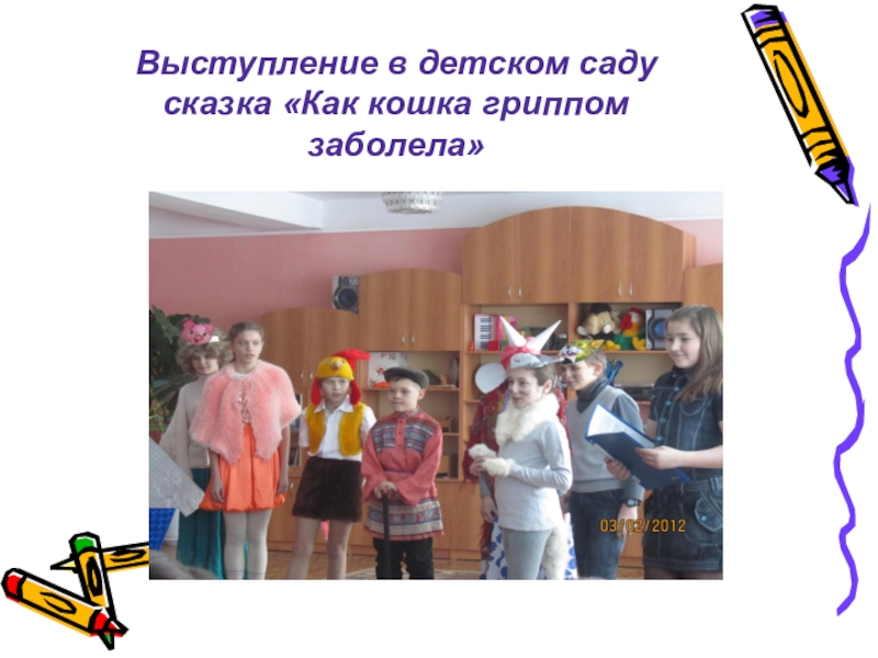 Слайд 21Выступление в детском саду сказка «Как кошка гриппом заболела»