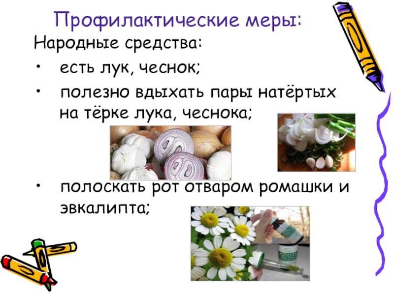 Профилактические меры:Народные средства:есть лук, чеснок; полезно вдыхать пары натёртых на тёрке лука, чеснока;полоскать рот отваром ромашки и