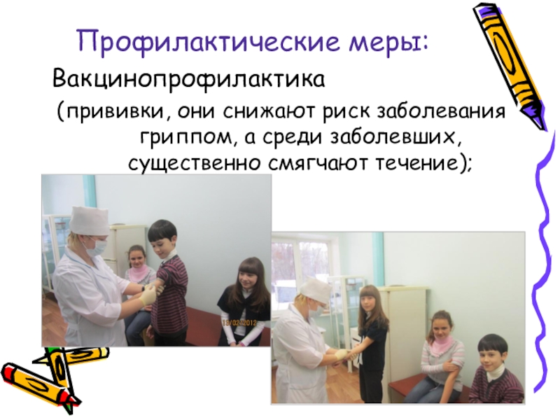 Профилактические меры:Вакцинопрофилактика (прививки, они снижают риск заболевания гриппом, а среди заболевших, существенно смягчают течение);