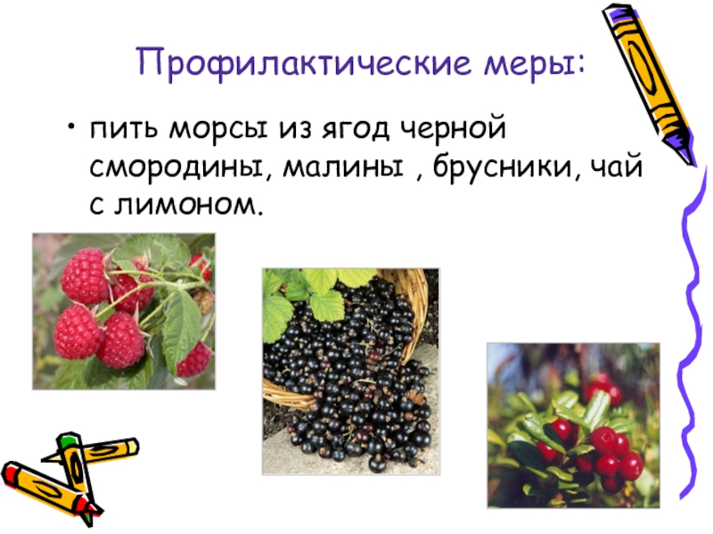 Профилактические меры:пить морсы из ягод черной смородины, малины , брусники, чай с лимоном.